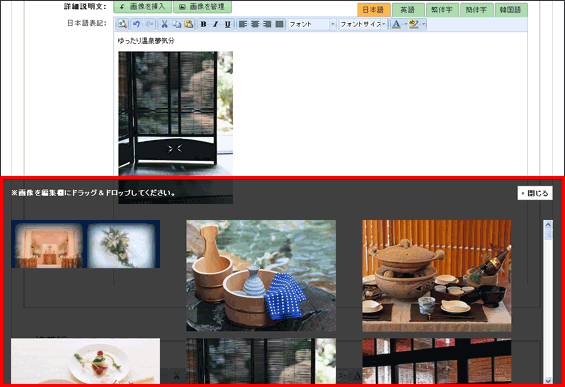 「画像を挿入」ボタンをクリックすると下図のように画面下部にアップロード済み画像の一覧が表示されます。